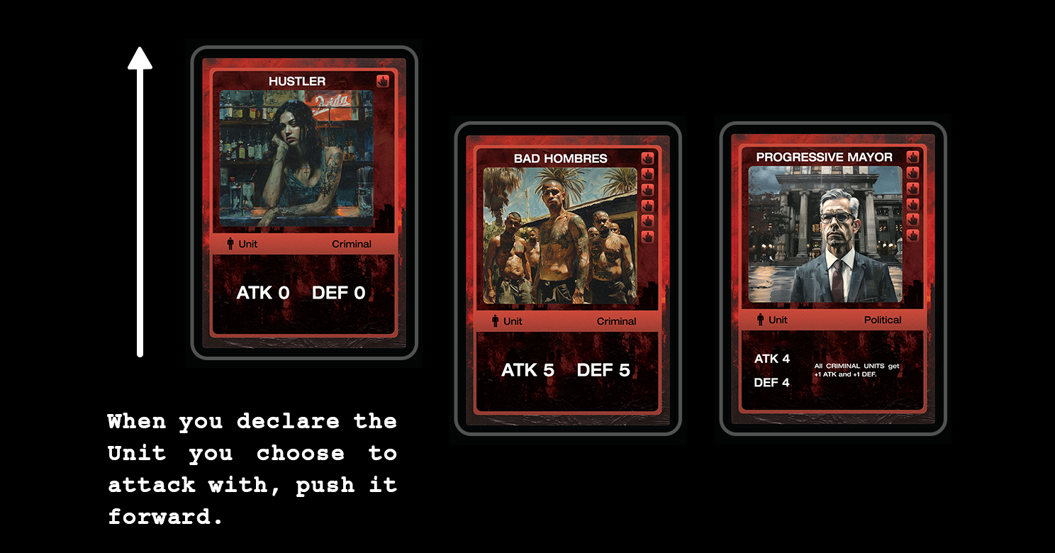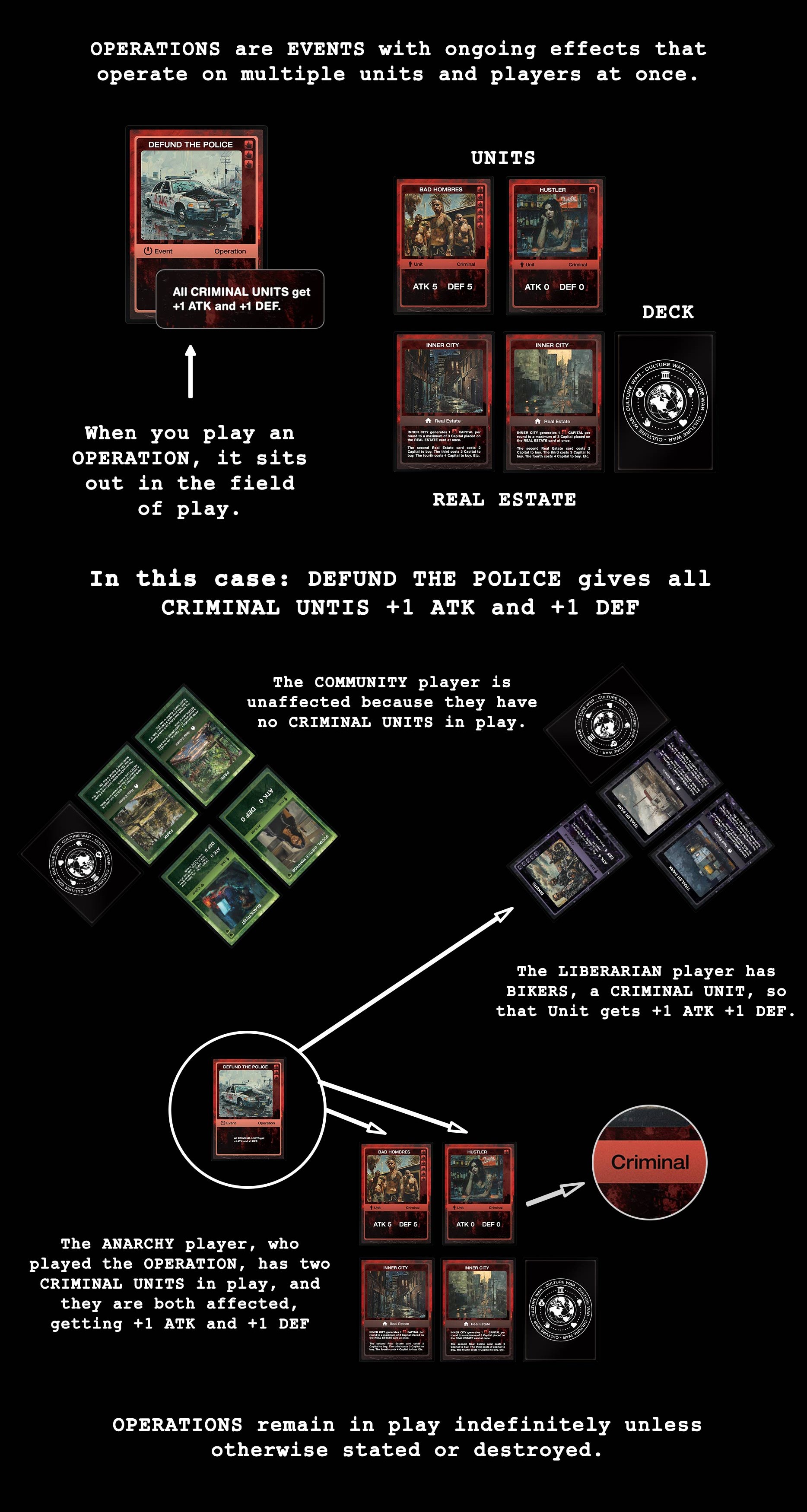 In CULTURE WAR, the assets and abilities available to players are represented through the game’s diverse card system.